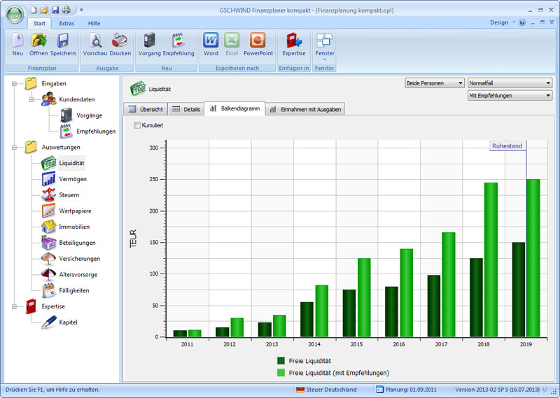 Der GSCHWIND Finanzplaner kompakt ermöglicht einen schnellen und einfachen Finanzcheck Ihrer Beratungskunden. Eine vereinfachte Erfassung bietet die Möglichkeit, die wichtigsten Daten auch direkt mit dem Kunden zusammen aufzunehmen. Hochrechnungen in den Bereichen Liquidität, Vermögen und Steuern liefern einen Überblick über die zukünftige Entwicklung. Die wichtigsten Kennzahlen der Anlagen und Verträge werden Ihnen in kompakten Aufstellungen zur Verfügung gestellt. Fünf Risikoszenarien sind ebenso darstellbar wie ein ausdifferenziertes Empfehlungsportfolio. Die Ausgabe einer hochwertigen Dokumentation rundet Ihre Planung mit dem GSCHWIND Finanzplaner kompakt ab.